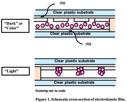 Electrokinetic (EK) film technology employs an optical switching film that can be applied to glass surfaces in windows or doors enabling electronic control of the color and tint. Crown’s electrokinetic film (“CEK Film”) derived from ink and microfluidic technology developed at Hewlett-Packard Company. The technology utilizes nanometer-sized pigment particles that are electrically charged and suspended in a liquid sandwiched between two clear substrates. A transparent conductor is deposited on the inside surfaces of the plastic films. In a non-energized state, the suspended pigment particles are distributed uniformly between the plastic films, and will absorb, transmit, or reflect light depending on the properties of the suspended pigment. When the proper electrical signal is applied to the conductive Indium Tin Oxide (ITO) layers, an electrical field is created and the charged pigment particles collect in micro-embossed holes in a layer of polymer resin over the transparent conductor surface. As the charged pigment particles are collected, the fluid becomes highly transparent (light state). By applying a different electrical signal, the pigment can be dispersed back into the fluid to achieve the desired color density.