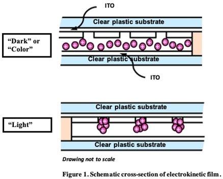 Electrokinetic (EK) film technology employs an optical switching film that can be applied to glass surfaces in windows or doors enabling electronic control of the color and tint. Crown’s electrokinetic film (“CEK Film”) derived from ink and microfluidic technology developed at Hewlett-Packard Company. The technology utilizes nanometer-sized pigment particles that are electrically charged and suspended in a liquid sandwiched between two clear substrates. A transparent conductor is deposited on the inside surfaces of the plastic films. In a non-energized state, the suspended pigment particles are distributed uniformly between the plastic films, and will absorb, transmit, or reflect light depending on the properties of the suspended pigment. When the proper electrical signal is applied to the conductive Indium Tin Oxide (ITO) layers, an electrical field is created and the charged pigment particles collect in micro-embossed holes in a layer of polymer resin over the transparent conductor surface. As the charged pigment particles are collected, the fluid becomes highly transparent (light state). By applying a different electrical signal, the pigment can be dispersed back into the fluid to achieve the desired color density.