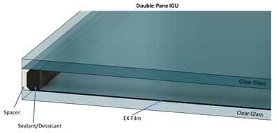 Our electronic film can be cut using standard laser cutting and then laminated between panes of glass for new window construction. DynamicTint will be laminated between glass sheets for automotive applications or on a single glass sheet within an Insulated Glass Unit (IGU) (Figure 3). An IGU typically consist of two or more panes of glass that are sealed along the edges with an inert glass like Argon between the panes of glass to minimize heat transfer from one pane of glass to the other. Lower heat transfer improves insulating the outside temperature from interior temperature. Power is provided to our device by two wires connected to a single small area on each ITO surface. The wires will be routed through the IGU edge seal and can be connected to a control/power unit attached to the IGU for individual window control. The electronics driving the film can be hardwired into the buildings HVAC control system or controlled wirelessly depending on the customer’s needs. Because the overall power requirements are extremely low, localized batteries in the control unit and/or in combination with a small area solar cell can be used to power DynamicTint.