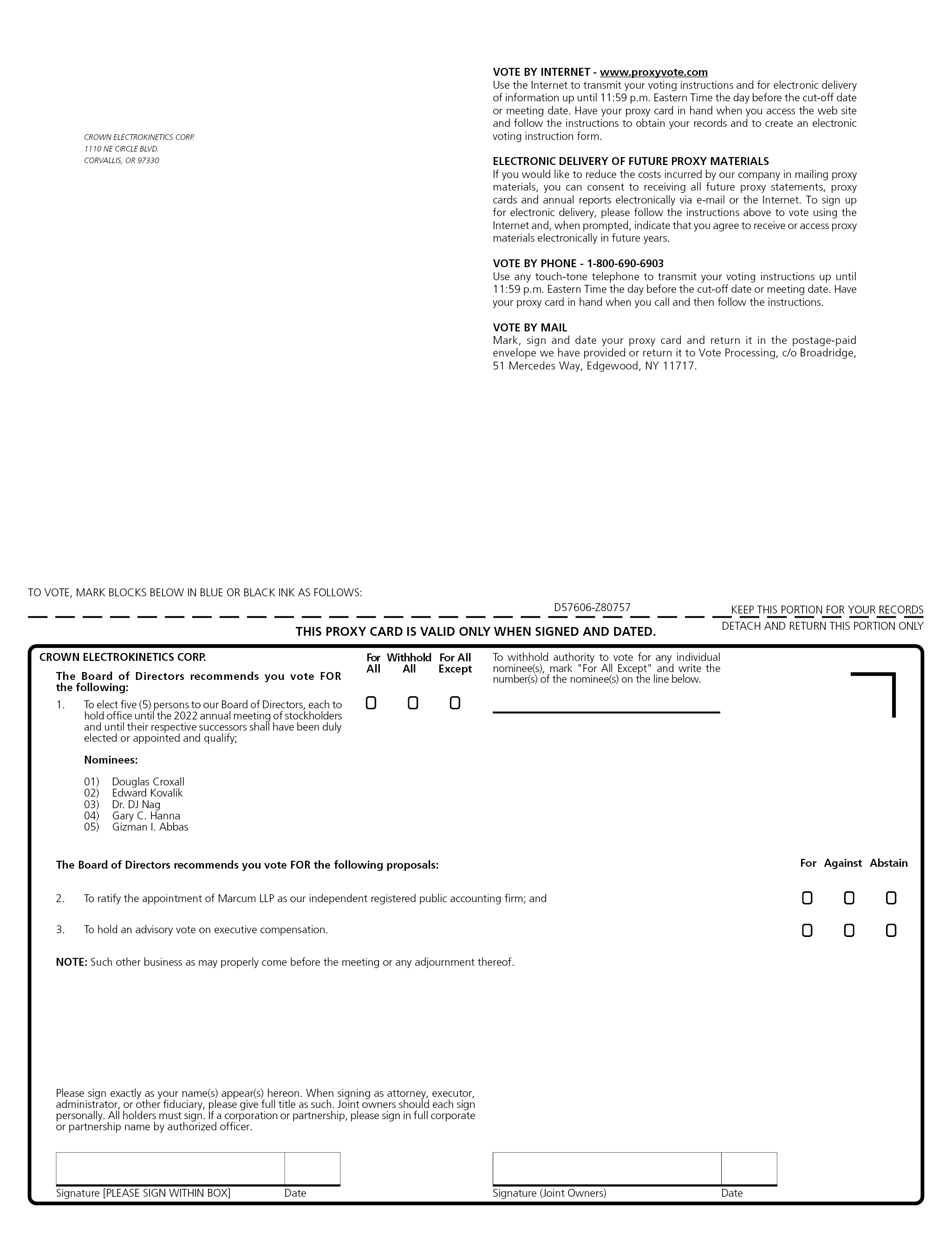 CROWN ELECTROKINETICS CORP. 1110 NE CIRCLE BLVD. CORVALLIS, OR 97330 VOTE BY INTERNET - www.proxyvote.com Use the Internet to transmit your voting instructions and for electronic delivery of information up until 11:59 p.m. Eastern Time the day before the cut-off date or meeting date. Have your proxy card in hand when you access the web site and follow the instructions to obtain your records and to create an electronic voting instruction form. ELECTRONIC DELIVERY OF FUTURE PROXY MATERIALS If you would like to reduce the costs incurred by our company in mailing proxy materials, you can consent to receiving all future proxy statements, proxy cards and annual reports electronically via e-mail or the Internet. To sign up for electronic delivery, please follow the instructions above to vote using the Internet and, when prompted, indicate that you agree to receive or access proxy materials electronically in future years. VOTE BY PHONE - 1-800-690-6903 Use any touch-tone telephone to transmit your voting instructions up until 11:59 p.m. Eastern Time the day before the cut-off date or meeting date. Have your proxy card in hand when you call and then follow the instructions. VOTE BY MAIL Mark, sign and date your proxy card and return it in the postage-paid envelope we have provided or return it to Vote Processing, c/o Broadridge, 51 Mercedes Way, Edgewood, NY 11717. TO VOTE, MARK BLOCKS BELOW IN BLUE OR BLACK INK AS FOLLOWS: D57606-Z80757 KEEP THIS PORTION FOR YOUR RECORDS DETACH AND RETURN THIS PORTION ONLY THIS PROXY CARD IS VALID ONLY WHEN SIGNED AND DATED. CROWN ELECTROKINETICS CORP. The Board of Directors recommends you vote FOR the following: For All Withhold All For All Except To withhold authority to vote for any individual nominee(s), mark “For All Except” and write the number(s) of the nominee(s) on the line below. 1. To elect five (5) persons to our Board of Directors, each to hold office until the 2022 annual meeting of stockholders and until their respective successors shall have been duly elected or appointed and qualify; Nominees: 01) Douglas Croxall 02) Edward Kovalik 03) Dr. DJ Nag 04) Gary C. Hanna 05) Gizman I. Abbas The Board of Directors recommends you vote FOR the following proposals: 2. To ratify the appointment of Marcum LLP as our independent registered public accounting firm; and For Against Abstain 3. To hold an advisory vote on executive compensation. NOTE: Such other business as may properly come before the meeting or any adjournment thereof. Please sign exactly as your name(s) appear(s) hereon. When signing as attorney, executor, administrator, or other fiduciary, please give full title as such. Joint owners should each sign personally. All holders must sign. If a corporation or partnership, please sign in full corporate or partnership name by authorized officer. Signature [PLEASE SIGN WITHIN BOX] Date Signature (Joint Owners) Date