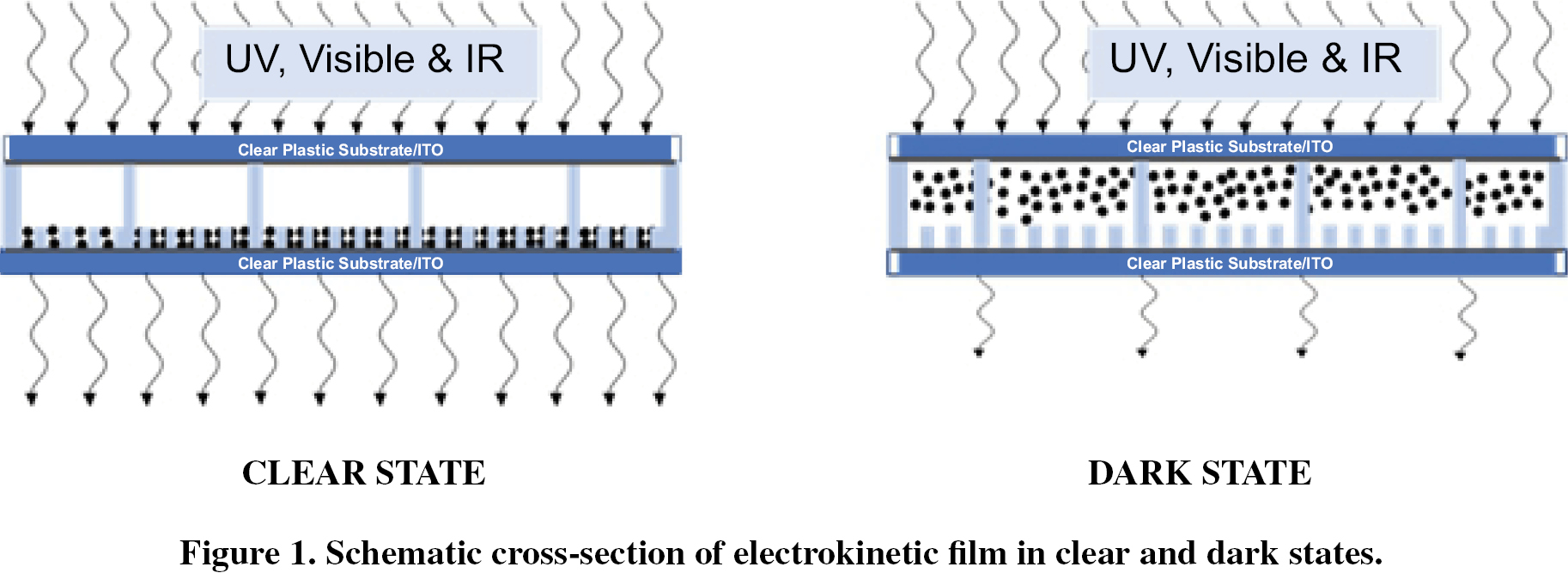Crown’s electrokinetic (EK) technology was derived from proprietary ink and microfluidic technology developed at HP. Electrokinetic refers to the movement of particles within a fluid under the influence of an electric field. Our EK film technology utilizes nanometer-sized pigment particles that are electrically charged and suspended in a liquid that is sandwiched between two clear substrates that are coated with a transparent conductor oxide (TCO) film. Figure 1. In a non-energized state, the suspended pigment particles are distributed uniformly between the plastic films, and will absorb, transmit, or reflect light depending on the properties of the suspended pigment (dark state). When the proper electrical signal is applied to the conductive TCO layers, an electrical field is created, and the charged pigment particles collect in micro-embossed holes in a layer of polymer resin covering the transparent conductor surface. As the charged pigment particles are collected, the fluid becomes highly transparent (clear state). By applying a different electrical signal, the pigment can be dispersed back into the fluid to achieve the desired color density or opaqueness.