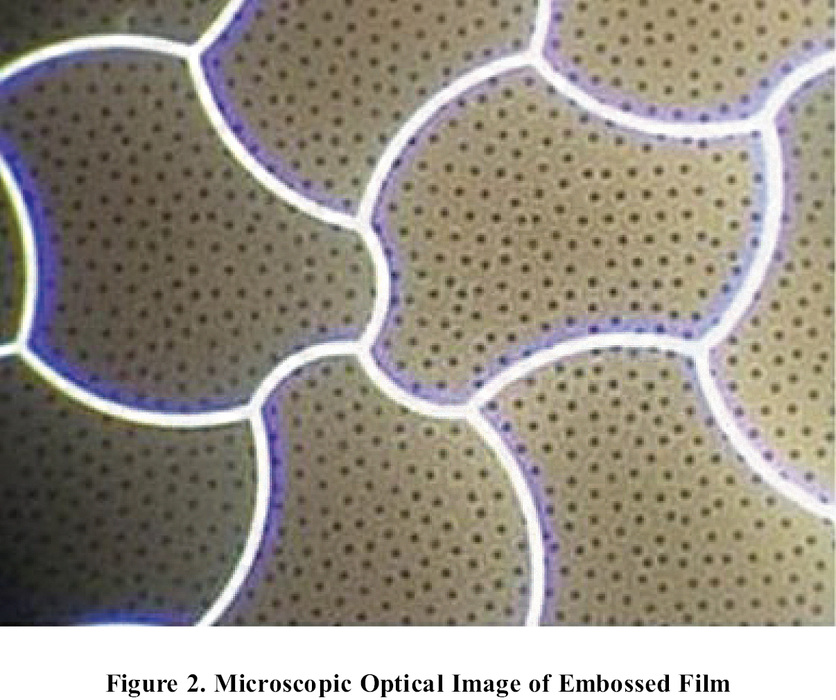2) Embossing: R2R embossing of UV-curable resin in a proprietary and patent protected 3-D pattern for ink pigment control and containment on one of the two plastic films. An example of the embossed pattern is shown in Figure 2. The R2R embossing process can be completed by various plastic film companies. Crown has the capability to accomplish the coating and embossing steps within its current facility in addition to working with manufacturing partners.