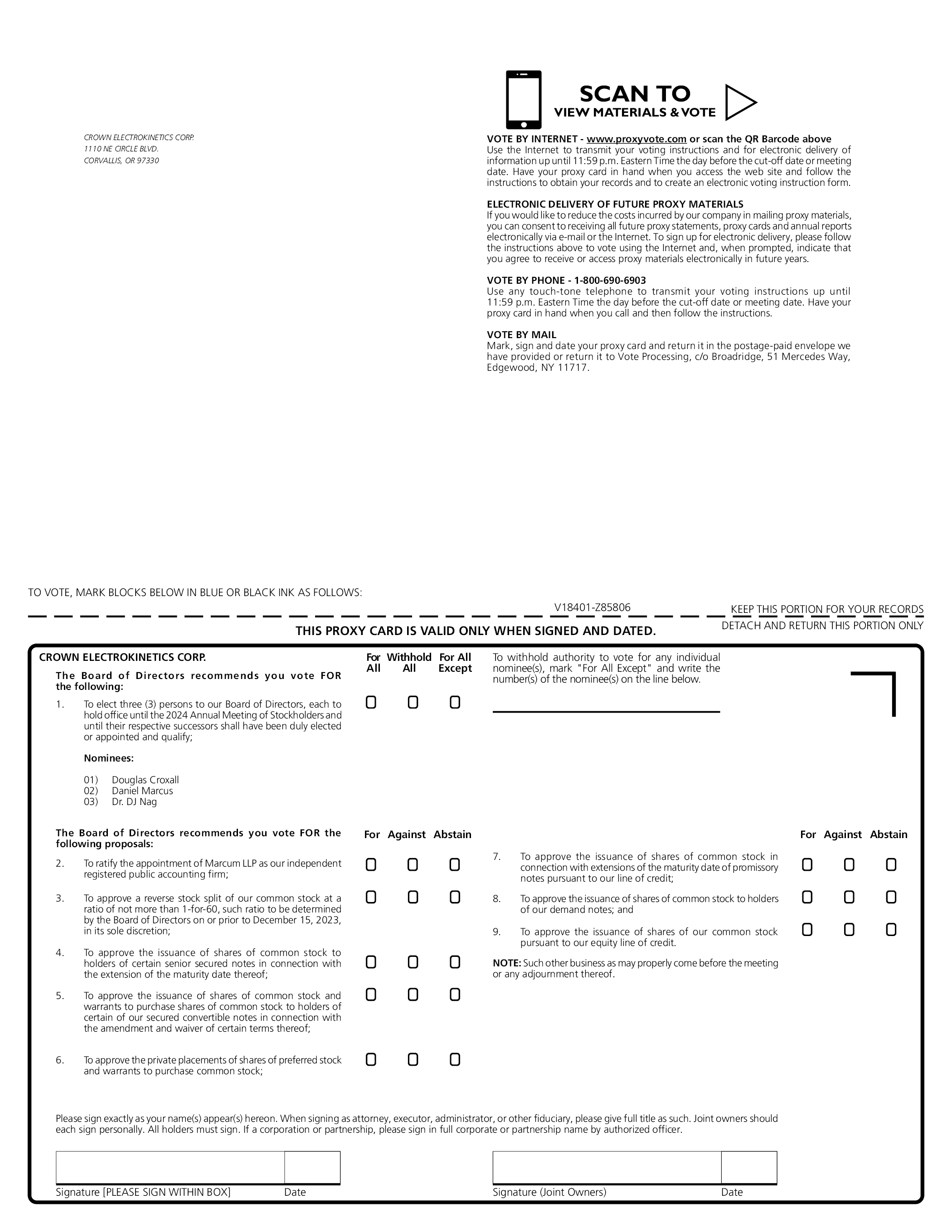 SCAN TO VIEW MATERIALS & VOTE CROWN ELECTROKINETICS CORP. 1110 NE CIRCLE BLVD. CORVALLIS, OR 97330 VOTE BY INTERNET - www.proxyvote.com or scan the QR Barcode above Use the Internet to transmit your voting instructions and for electronic delivery of information up until 11:59 p.m. Eastern Time the day before the cut-off date or meeting date. Have your proxy card in hand when you access the web site and follow the instructions to obtain your records and to create an electronic voting instruction form. ELECTRONIC DELIVERY OF FUTURE PROXY MATERIALS If you would like to reduce the costs incurred by our company in mailing proxy materials, you can consent to receiving all future proxy statements, proxy cards and annual reports electronically via e-mail or the Internet. To sign up for electronic delivery, please follow the instructions above to vote using the Internet and, when prompted, indicate that you agree to receive or access proxy materials electronically in future years. VOTE BY PHONE - 1-800-690-6903 Use any touch-tone telephone to transmit your voting instructions up until 11:59 p.m. Eastern Time the day before the cut-off date or meeting date. Have your proxy card in hand when you call and then follow the instructions. VOTE BY MAIL Mark, sign and date your proxy card and return it in the postage-paid envelope we have provided or return it to Vote Processing, c/o Broadridge, 51 Mercedes Way, Edgewood, NY 11717. TO VOTE, MARK BLOCKS BELOW IN BLUE OR BLACK INK AS FOLLOWS: V18401-Z85806 KEEP THIS PORTION FOR YOUR RECORDS THIS PROXY CARD IS VALID ONLY WHEN SIGNED AND DATED. CROWN ELECTROKINETICS CORP. For Withhold For All To withhold authority to vote for any individual nominee(s), mark “For All Except” and write the number(s) of the nominee(s) on the line below. The Board of Directors recommends you vote FOR the following: All All Except 1. To elect three (3) persons to our Board of Directors, each to hold office until the 2024 Annual Meeting of Stockholders and until their respective successors shall have been duly elected or appointed and qualify; Nominees: 01) Douglas Croxall 02) Daniel Marcus 03) Dr. DJ Nag The Board of Directors recommends you vote FOR the following proposals: For Against Abstain 2. To ratify the appointment of Marcum LLP as our independent registered public accounting firm; 3. To approve a reverse stock split of our common stock at a ratio of not more than 1-for-60, such ratio to be determined by the Board of Directors on or prior to December 15, 2023, in its sole discretion; 4. To approve the issuance of shares of common stock to holders of certain senior secured notes in connection with the extension of the maturity date thereof; 5. To approve the issuance of shares of common stock and warrants to purchase shares of common stock to holders of certain of our secured convertible notes in connection with the amendment and waiver of certain terms thereof; 6.To approve the private placements of shares of preferred stock and warrants to purchase common stock; 7. To approve the issuance of shares of common stock in connection with extensions of the maturity date of promissory notes pursuant to our line of credit; 8. To approve the issuance of shares of common stock to holders of our demand notes; and 9. To approve the issuance of shares of our common stock pursuant to our equity line of credit. NOTE: Such other business as may properly come before the meeting or any adjournment thereof. Please sign exactly as your name(s) appear(s) hereon. When signing as attorney, executor, administrator, or other fiduciary, please give full title as such. Joint owners should each sign personally. All holders must sign. If a corporation or partnership, please sign in full corporate or partnership name by authorized officer. Signature [PLEASE SIGN WITHIN BOX] Date Signature (Joint Owners) Date