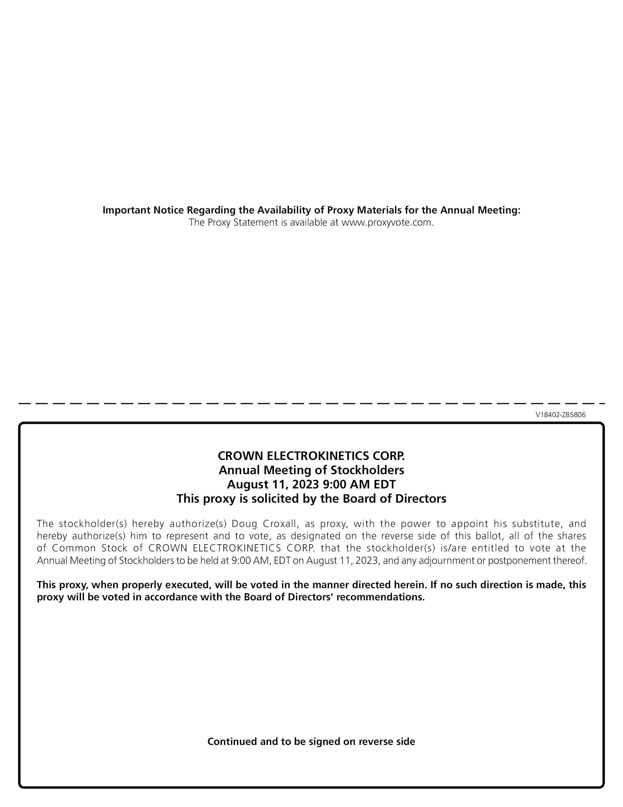 Important Notice Regarding the Availability of Proxy Materials for the Annual Meeting: The Proxy Statement is available at www.proxyvote.com. V18402-Z85806 CROWN ELECTROKINETICS CORP. Annual Meeting of Stockholders August 11, 2023 9:00 AM EDT This proxy is solicited by the Board of Directors The stockholder(s) hereby authorize(s) Doug Croxall, as proxy, with the power to appoint his substitute, and hereby authorize(s) him to represent and to vote, as designated on the reverse side of this ballot, all of the shares of Common Stock of CROWN ELECTROKINETICS CORP. that the stockholder(s) is/are entitled to vote at the Annual Meeting of Stockholders to be held at 9:00 AM, EDT on August 11, 2023, and any adjournment or postponement thereof. This proxy, when properly executed, will be voted in the manner directed herein. If no such direction is made, this proxy will be voted in accordance with the Board of Directors’ recommendations. Continued and to be signed on reverse side